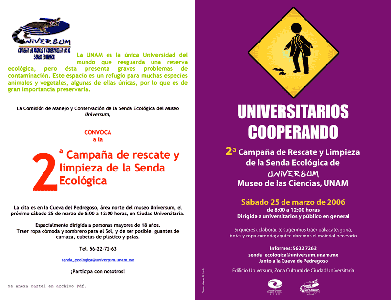 Aunque no se trate de Futból, creo que es bueno Ayudar a la UNAM, y como apoyo a eso, aqui esta una convocatoria para que Ayudemos a la Limpieza de la Senda Ecológica de UNIVERSUM (el museo de Ciencias de la UNAM).